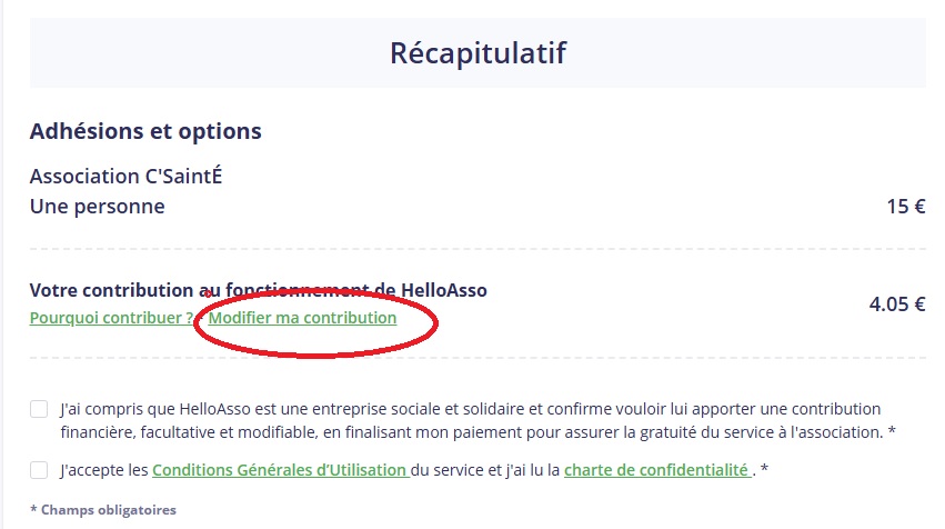 Au moment de votre paiement, HelloAsso propose automatiquement une « contribution » pour leur plateforme (HelloAsso est une plateforme entièrement gratuite dédiée aux associations). Vous pouvez librement modifier votre contribution si vous ne souhaitez pas en faire