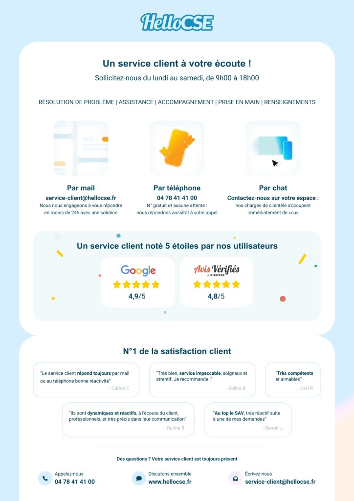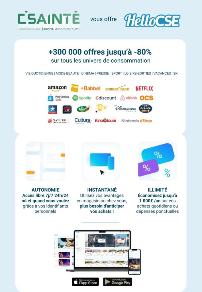 L’association propose à ses adhérents la billetterie en ligne « HelloCSE ». Cette billetterie est également consultable sur smartphone. Elle vous propose des réductions sur une multitude d’enseignes. Chaque adhérent reçoit ses propres codes d’accès afin de bénéficier de cette billetterie de manière autonome https://www.hellocse.fr/